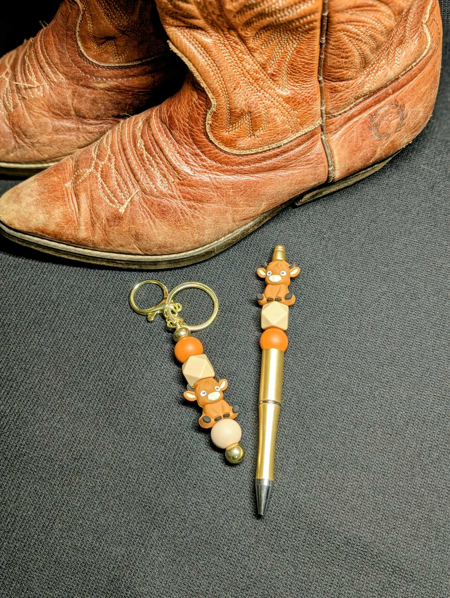 Ensemble stylo bille et porte-clés assorti modèle VACHE brun clair.